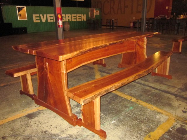 The seating inside features the most beautiful picnic tables I have seen so far. Beautiful lacquered single slabs of wood with live edges.