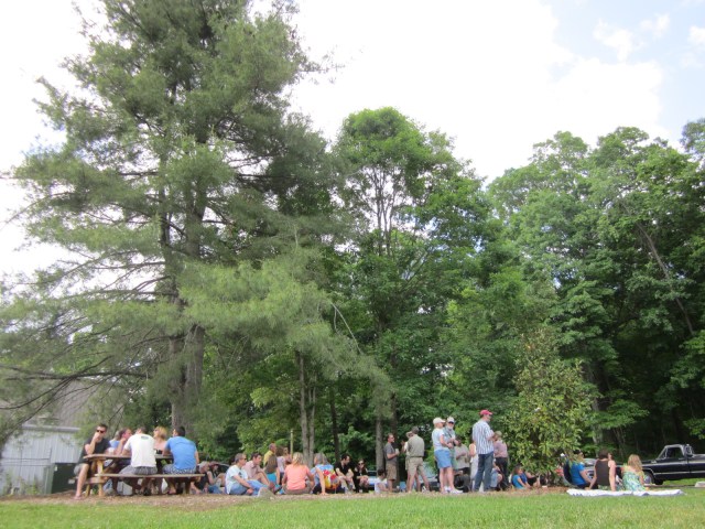 10 of us pull out of our cars in the big parking lot and make our way to a big field where other folks are trickling in for the start of a festival day. The field and wide open. There are woods surrounding the entire grounds and hiking trails sprouting out all over the place. There are only a handful of picnic tables in the field in anticipation of a small crowd of festival goers that would be dancing, tossing frisbees, and playing with dogs.