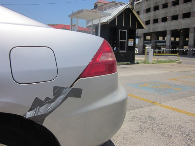 I ask Jessie to go try my genius new-ticket scheme as I duct tape up my bumper.  She returns stub-less.  The gate works on a sensor and wont work if there is no car there.