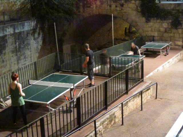 I ignore the huge artificial rock wall behind me. I brush off the set of 3 ping pong tables down by the little creek on the side of the property. I don’t even hear the music that is being piped in at a perfectly reasonable volume. I am just 100% content.