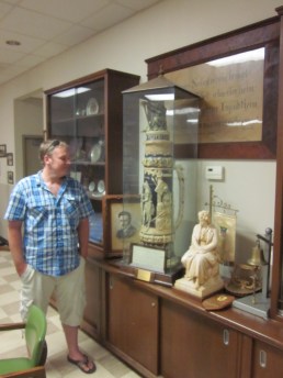 Back into the building, one of the coolest rooms of all. It is the room where the singers practice and have meetings. There are fine individual chairs set up in arching rows. Around the back are old photos, German insignia, awards, crests and flags. Then, I lay eyes upon the hugest beer stein I have ever seen. It is stunning.