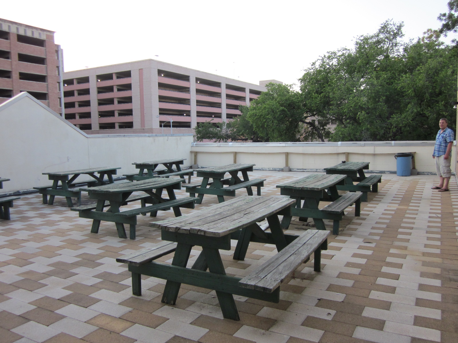 It is boxed in beside municipal buildings and towering parking structures. I park in a metered spot out front. As I walk around the building, I see plaques denoting this as a National Historic Place and a Texas Historic Site. I wander around back and enter through the garden. It is fantastic! It is so classic! There are 5 huge shade trees and 3 more are being planted. Around the 2 most prominent trees in the center of the garden are benches making a square frame at the bottom.