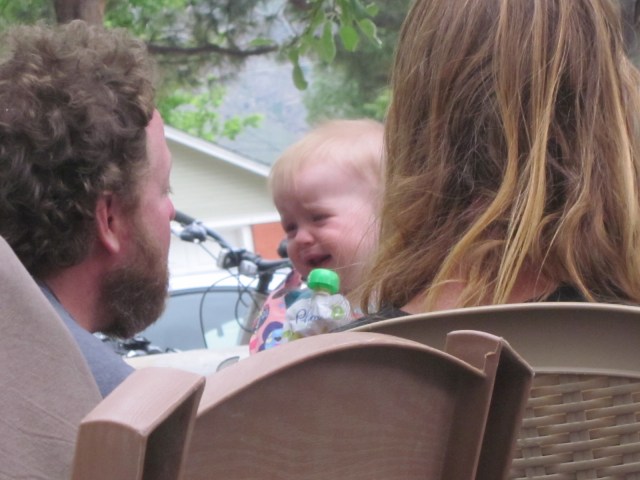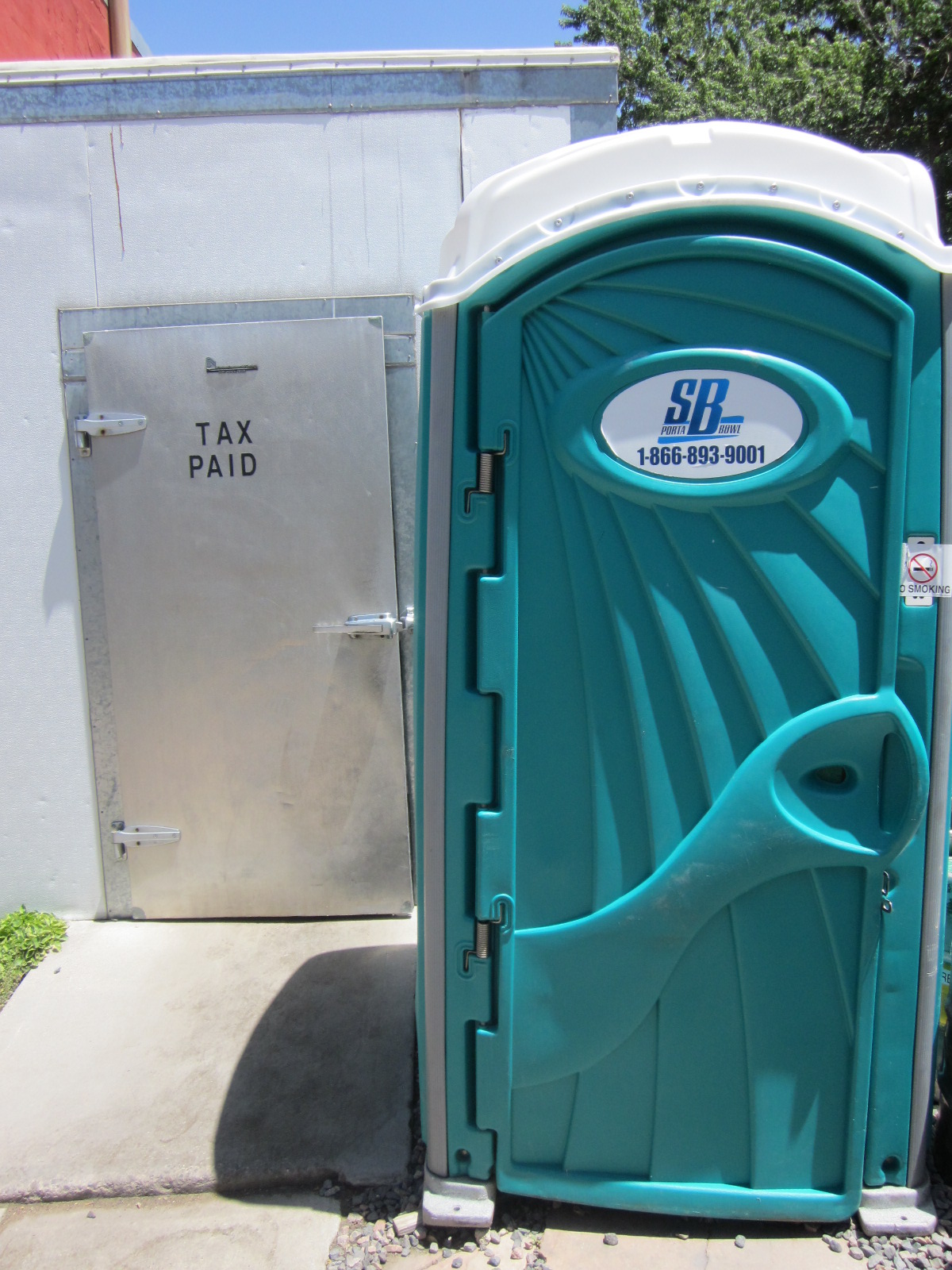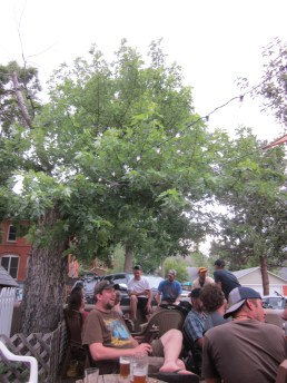 None of the furniture really matches at all; and when it does, it feels more like coincidence than intention. There also doesn’t seem to be any rhyme or reason to placement of furniture. There are spent kegs stacked all around the perimeter. Coarse gravel cools my feet and 2 shade trees block the midday sun. The toilet is a port-a-potty and it sits next to a huge freezer door marked “TAX PAID.” What? There is a side door that connects to the bar and just beyond view are the Rocky Mountains. Is this… love?