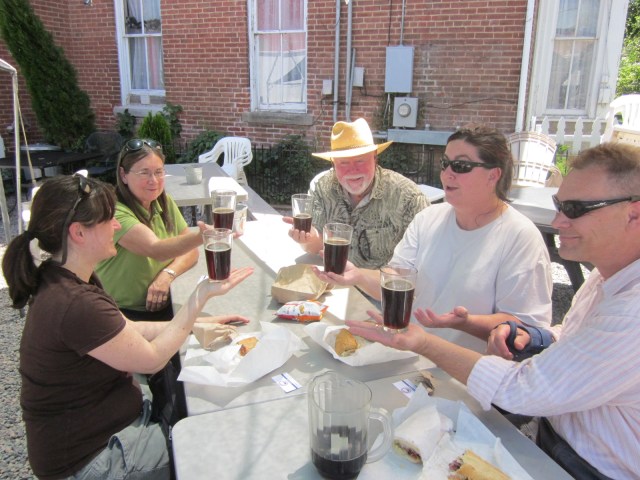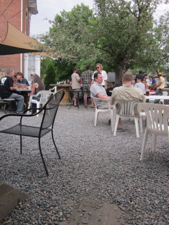 I introduce myself. Two of them turn out to be the main brewer and owner. The brewmaster has a jovial grin permanently plastered on his face. He tells me that this location, of course, used to be a house. He began brewing small batches in 1993. Then he began to offer growlers and samplers out the window. Eventually, customers wanted to hangout and drink their samplers in the grassy backyard, under the maple and apple trees (cool trees!).