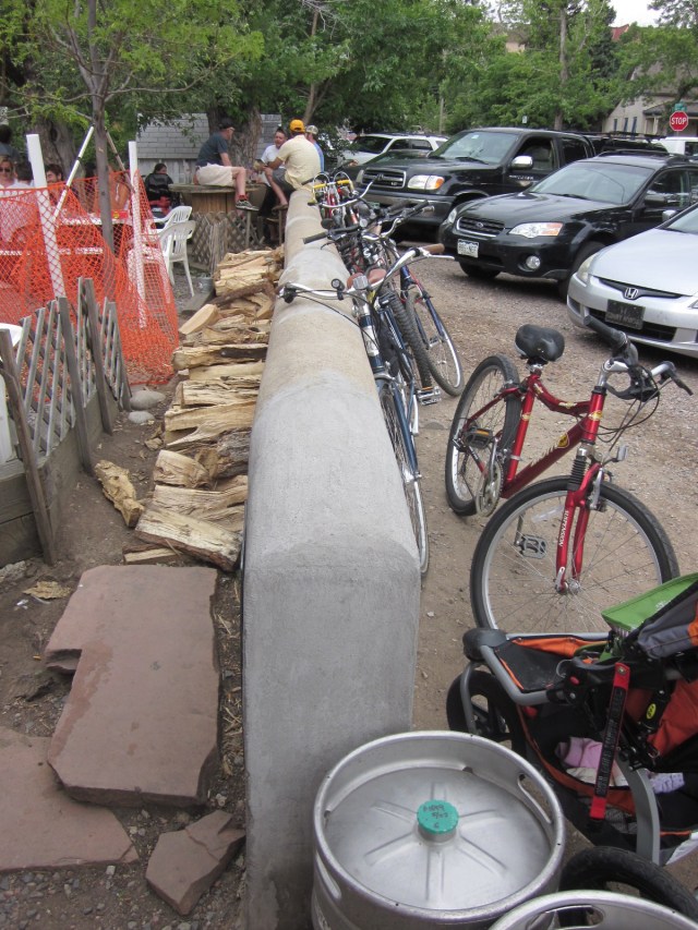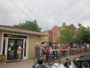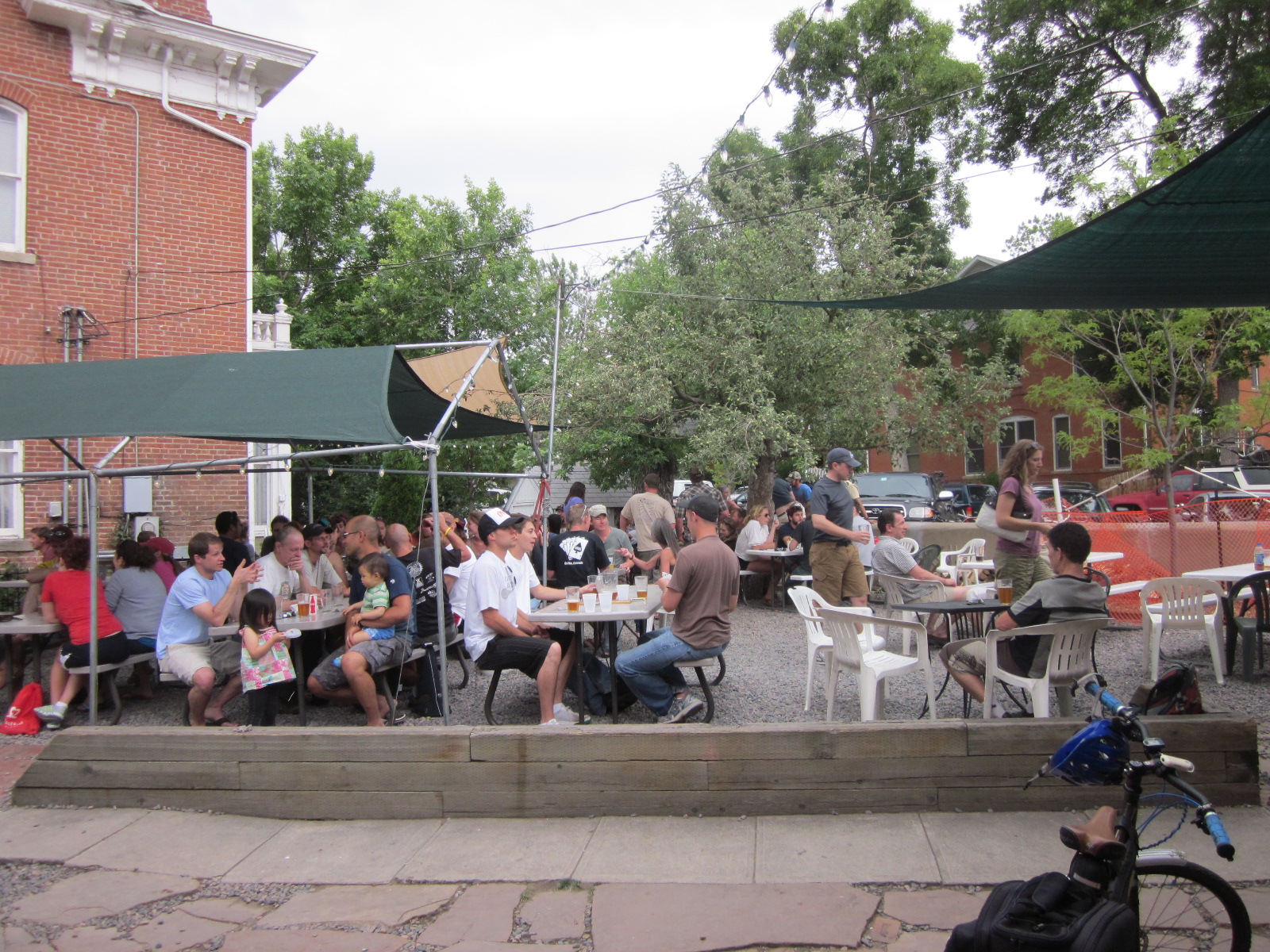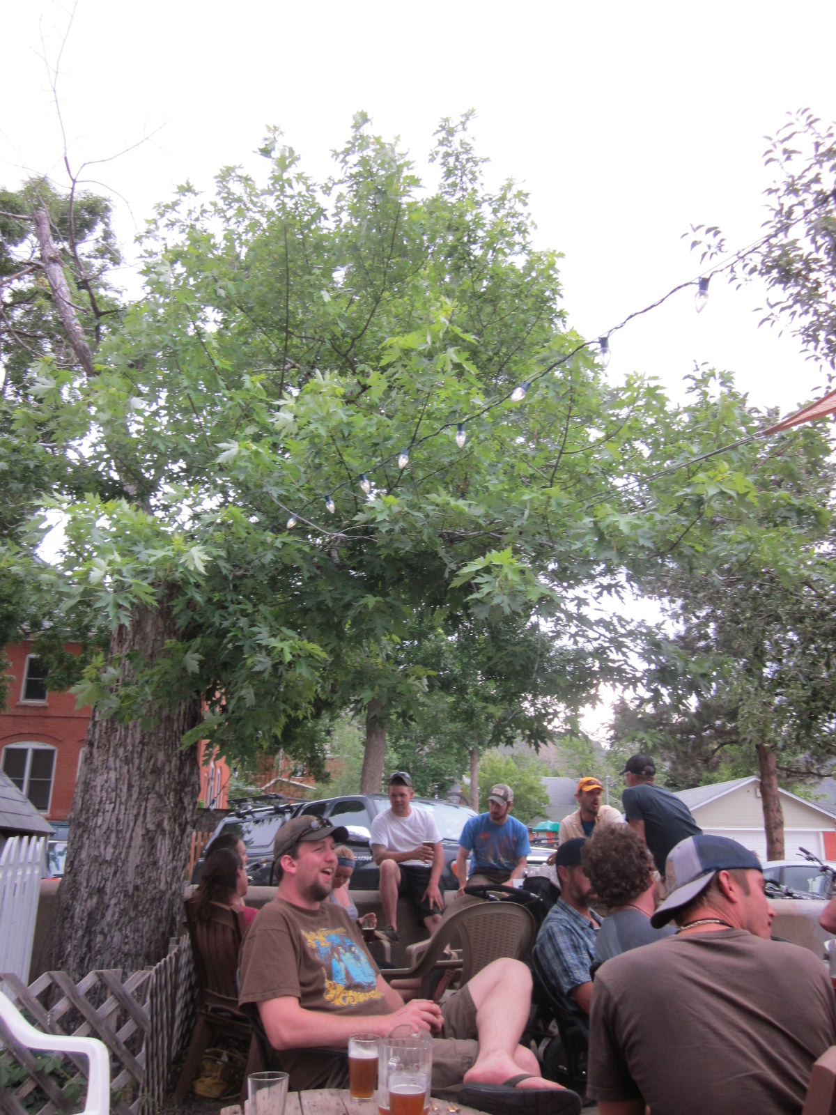 There are people of all kinds. Some students from the Colorado School of Mines, business folk, local neighbors and even workers from the Coors brewery. They are clustered in packs around tables or a makeshift circle of chairs. Dogs and kids are even roaming about. Everyone is talking and cheerful, and this will all shut down in about 20 minutes.
