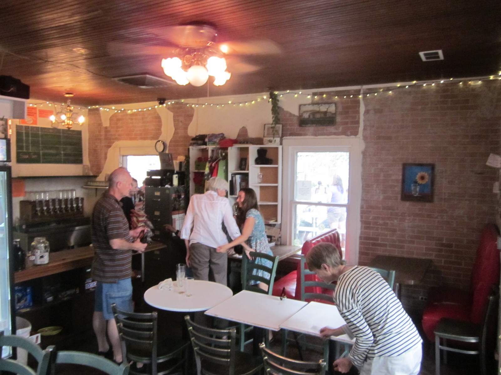 I go to the beer door and ask the free-beer tender if the owners are in. He says, that group of four guys sitting at the table inside are owners. Wow! They just looked like customers laughing over a beer and some lunch. I guess they can be both.