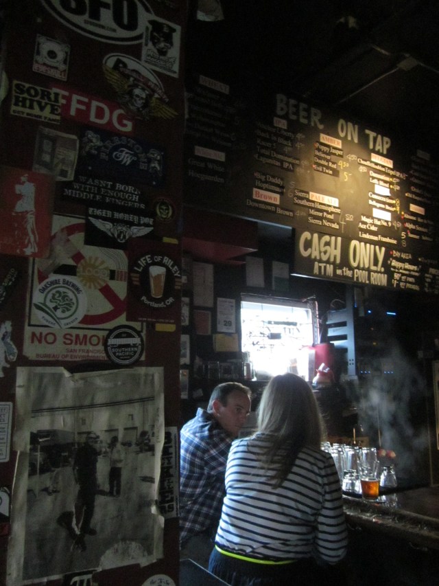 I feel like there may be a secret knock that is needed to gain entrance, but we proceed with a fake confidence through the black door with the skull playboy bunny logo stenciled on it anyway.  Inside, the walls are black, and there are tons of awesomely strange flyers, stickers and items on the walls.  Over the bar, huge blackboards present the beer menu and proclaim “Cash Only” and I know this place has a certain rebellious personality.
