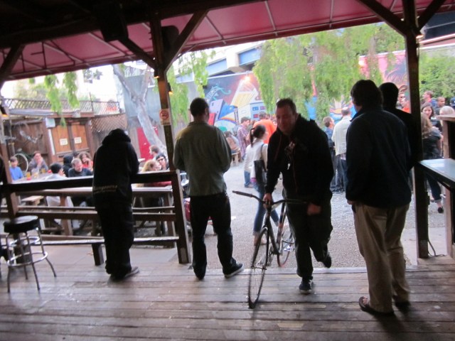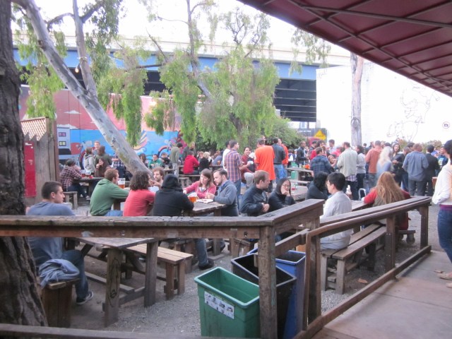 I am lucky enough to experience this most unique of beer gardens twice during my stay in San Francisco.  Upon my first visit, I don’t really know what to expect.  Zeitgeist has a “reputation”.  But, what that reputation is, I haven’t been able to really grasp.  I heard tell of an extremely lax atmosphere that lends itself to an anything-goes vibe once you are past the single black door entrance.  I don’t know if I should expect a quiet blissful garden with a waterfall or a grungy den of debauchery.  In a town where it is not only acceptable but unbelievably common to see someone light up a joint in the middle of the day on a busy sidewalk, I think it may be a little bit of both.